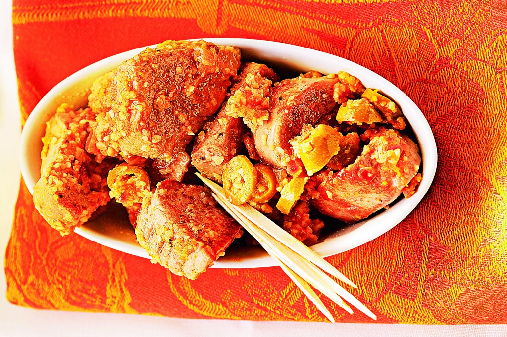 - Maja en un mortero el orégano con los dientes de ajo y una pizca de sal. Luego, corta el cerdo salpimentado en tacos de bocado y los embadurnas con el majado. Dóralos por todos los lados en una sartén honda con aceite de oliva y cocínalos bien.