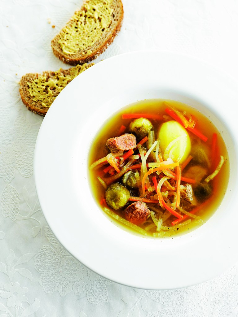 - Lava, pela y ralla la zanahoria. Corta la cebolla en juliana. Lava bien las coles de bruselas y las patatas peladas. Cuela el caldo y añádele la carne de cerdo reservada de las costillas y las verduras para el caldo. Deja que se cocine durante 25 minutos. Rectifica de sal y sirve bien caliente.