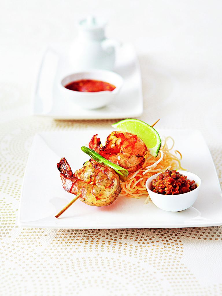 Brochetas de langostinos marinados, fideos fritos y salsa agridulce