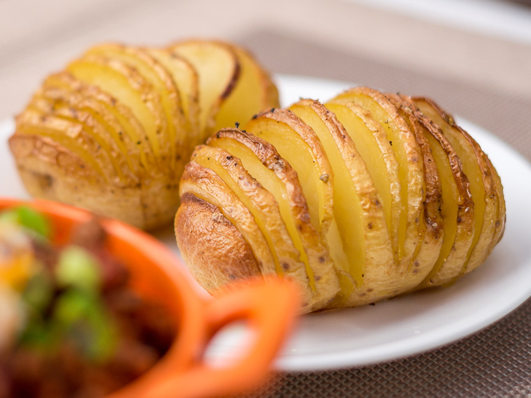 El sistema de corte al estilo Hasselback facilita la cocción y la entrada de sabores dentro de la patata. Este corte hace que quede muy crujiente por fuera y suave por dentro, con un montón de matices que no conseguimos con las patatas al horno clásicas. Pero la verdadera popularidad de este plato se debe al relleno que puede ponerse entre las láminas, desde especias como el romero, orégano o el tomillo hasta mantequilla con ajo o distintos tipos de queso.