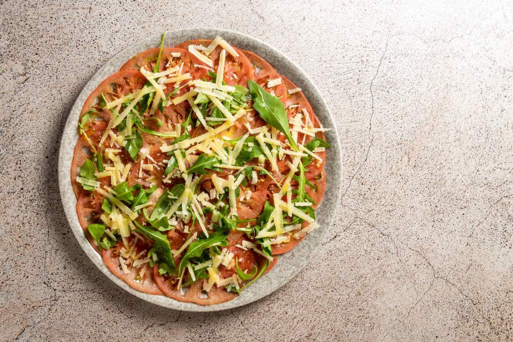 - Rúcula: Su sabor y textura añaden un contraste refrescante al plato, aportando un toque crujiente a la fina lámina de tomate.