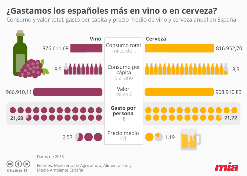 Tal y como se aprecia en esta infografía, el consumo de cerveza está superando con creces el consumo de vino. Según datos del Ministerio de Agricultura, Alimentación y Medio Ambiente, aunque el gasto en vino es mayor que el que se hace en cerveza, se consumen muchos más litros por persona al año de esta última que de vino. En 2015 se consumieron en España 816.952 miles de litros de cerveza frente a los 376.611 miles litros de vino que se consumieron.