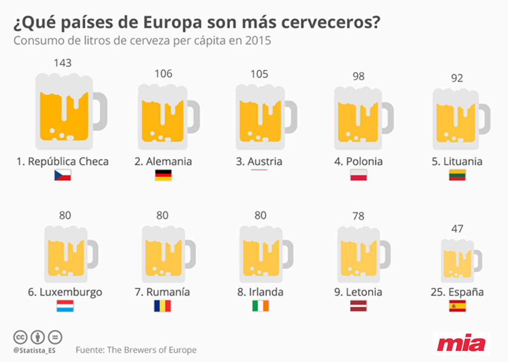 Según el informe "Beer statistics 2016 edition", elaborado por The Brewers of Europe, en 2015 España era el cuarto país con mayor consumo total de Europa, detrás de Alemania, Reino Unido y Polonia. Aunque en la ingesta por persona nuestro país está en el puesto 25 muy lejos de las primeras posiciones.