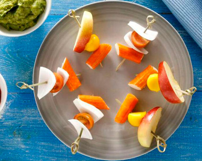 Un entrante sencillo de preparar y una opción socorrida para una comida informal. Con estas brochetas de surimi con frutas y verduras triunfarás gracias a la mezcla de sabores.
