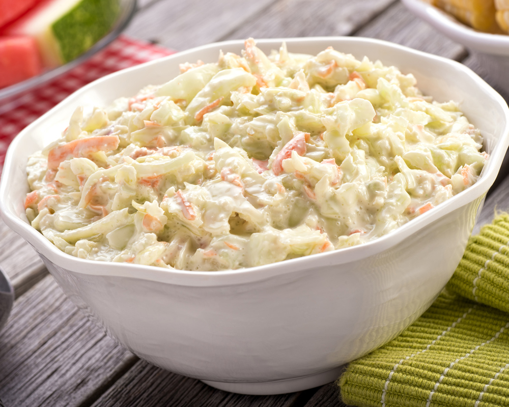 Esta ensalada, llamada también coleslaw, es muy popular en América, donde la sirven como acompañamiento de perritos calientes, hamburguesas o sándwiches. La original está hecha solo con repollo y zanahoria, pero nos da pié para añadir otros vegetales como lombarda o tallos de apio bien picaditos.