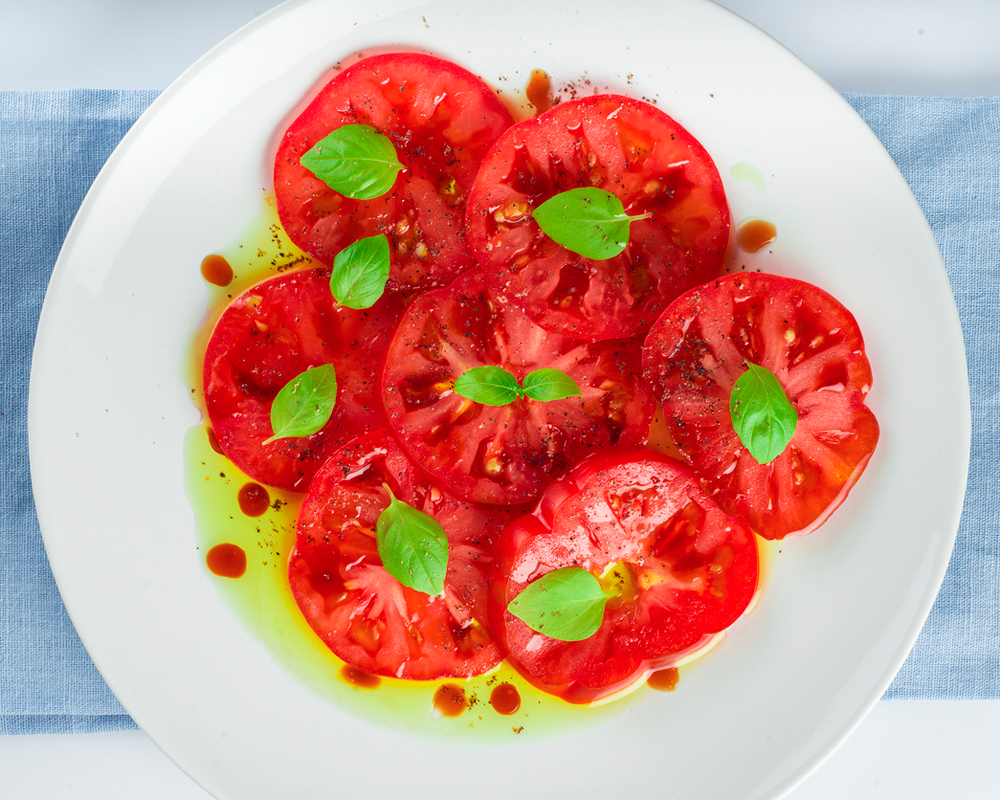 Este 'carpaccio' vegetal de tomate es una estupenda guarnición para platos de pollo. Eso sí, hay que prepararlo inmediatamente antes de servirlo; si lo haces con antelación, perderá sabor y textura.