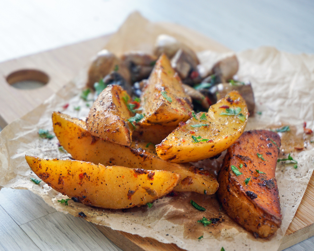 Corta las patatas en rodajas gruesas y dóralas con aceite en la sartén. Resérvalas y en esa misma sartén fríe unos dientes de ajo. Una vez fritos, machácalos en un mortero con orégano, pimentón, cominos y sal. Añade vinagre al mortero y remueve bien. Vuelve a poner las patatas en la sartén y échales por encima la mezcla sin dejar de remover. Ponlo todo a cocer 5 minutos hasta que veas que las patatas se quedan secas, sin líquido.