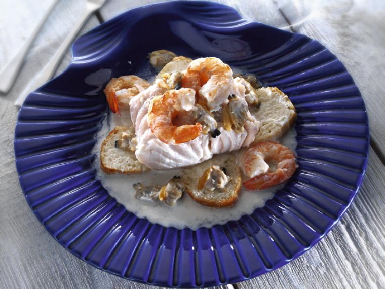 Una versión de lujo del clásico gazpachuelo malagueño. Ideal para las ocasiones más especiales, gracias al añadido de las almejas y los langostinos. Además, el aroma del vino blanco le aporta un toque extra a los medallones de merluza de calidad.