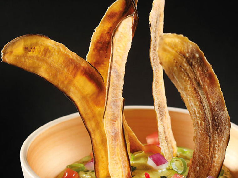 Se trata de hacer el guacamole según la receta tradicional, pero al acabar aderezarlo con aros del verde de cebolla, un cordón de aceite de oliva virgen extra y unos copos de flor de sal. Por último, clava los chips de plátano verde en el wakaplátano.