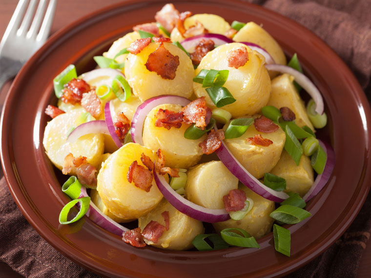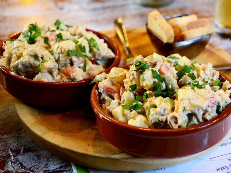 Muy propia de los meses de verano, la ensalada campera se elabora con patatas, tomate, atún, huevo, aceitunas, cebolla, y pimientos. Triunfa porque es muy fresquita y para comer es perfecta.