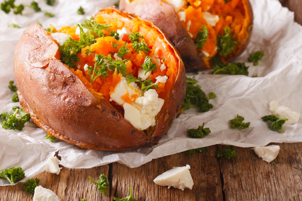Una receta sabrosa y fácil de hacer: boniatos al horno rellenos de queso y perejil. Te recomendamos que uses Parmesano o cualquier hierba aromática que te guste.