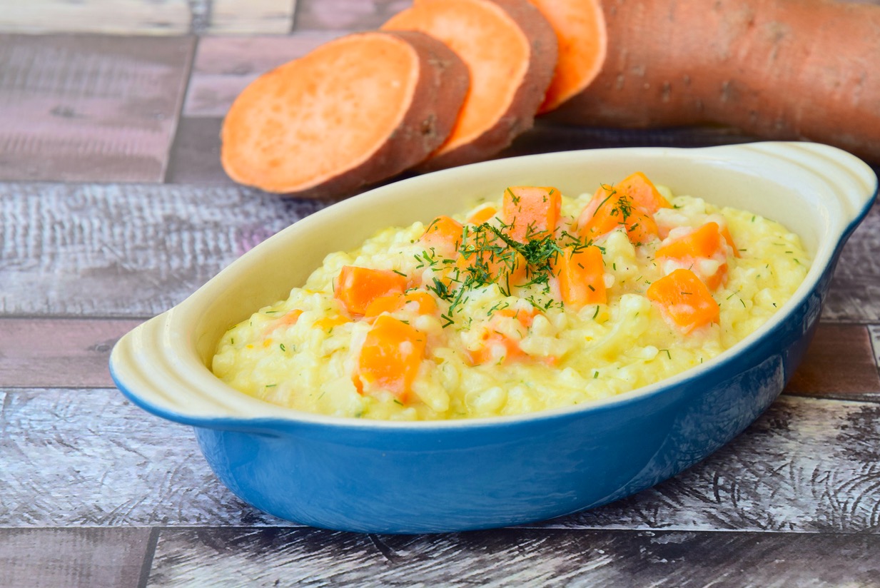 Puedes prepara un risotto casero con arroz bomba, setas, eneldo y boniato. Este último ingrediente le dará un sabor suave y delicioso al plato.