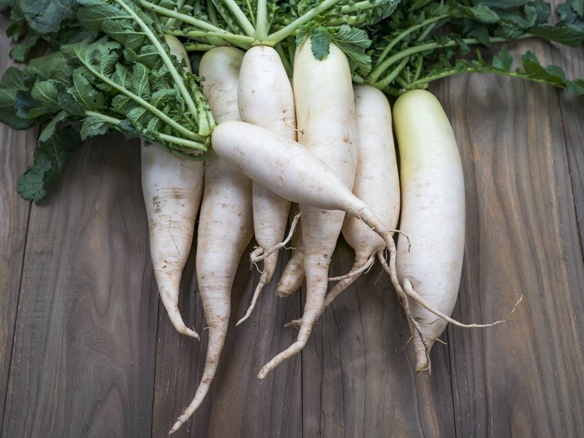 El rábano Daikon es una variedad japonesa que significa "gran raíz". ¿Sabías que algunos de estos ejemplares pueden llegar a medir medio metro? La apariencia del Daikon es similar al de una zanahoria, pero con un color similar al de la chirivía. Su sabor es como el del rábano común pero con un toque picante. Se puede consumir en crudo o cocido, ya sea en ensaladas, platos de arroz o guisos. Se suele emplear como aderezo y en recetas con curry. En cuanto a sus propiedades nutricionales, destaca su bajo aporte de calorías (20 kcal por cada 100 gramos). Además, es rico en vitaminas del grupo B y provitamina A o minerales como el hierro, el potasio, el magnesio, el sodio, el fósforo o el calcio. También es muy recomendable por sus propiedades que facilitan la digestión.
