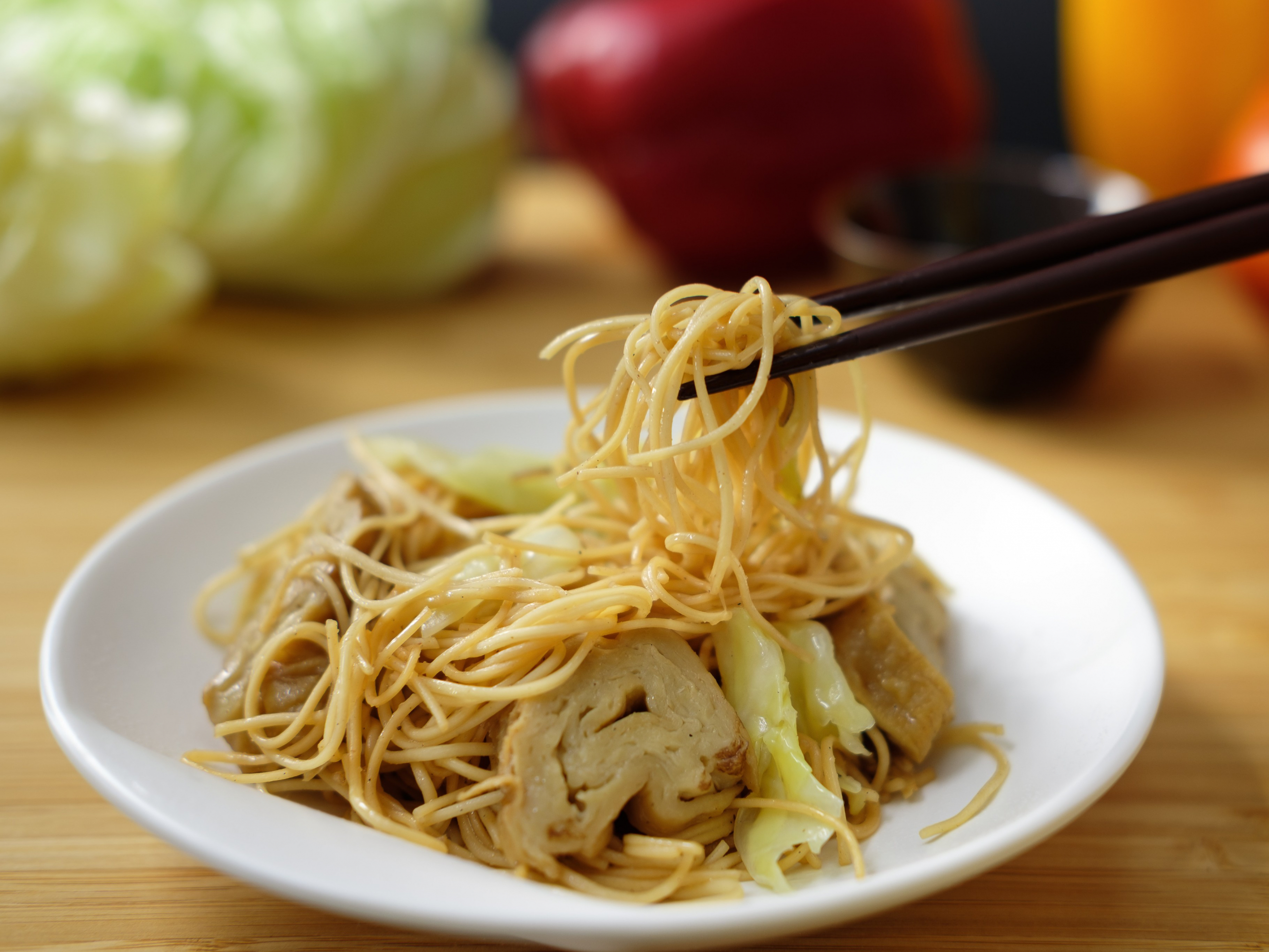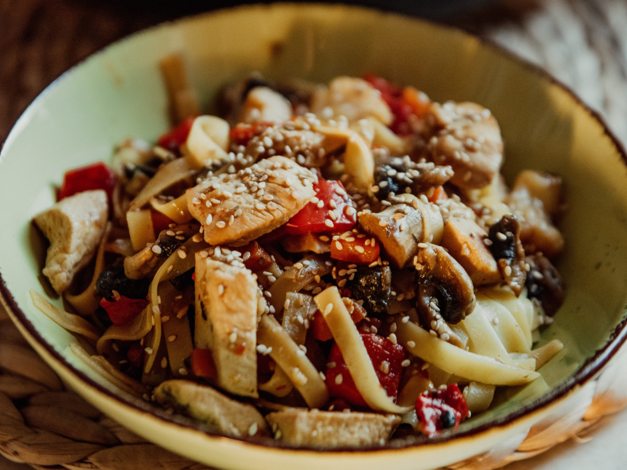 Tallarines al wok con verduras, gambas y brotes de bambú