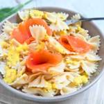 • 200 gr. de salmón ahumado• 250 gr. de pasta mariposa• SalPara la salsa: • 1 dl de vinagre de vino blanco• 1 dl de zumo de limón• 1 cucharada de mostaza a la antigua• 2 dl de aceite de oliva• 2 cucharadas de eneldo