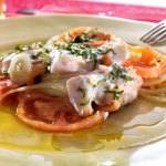Aceitar una fuente de horno y disponer encima las cebollas cortadas en gajos y los tomates pelados, sin simientes y cortados en rodajas