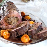 Servir la carne con la salsa, las setas fungi porcini reservadas y las bolitas de batata asada