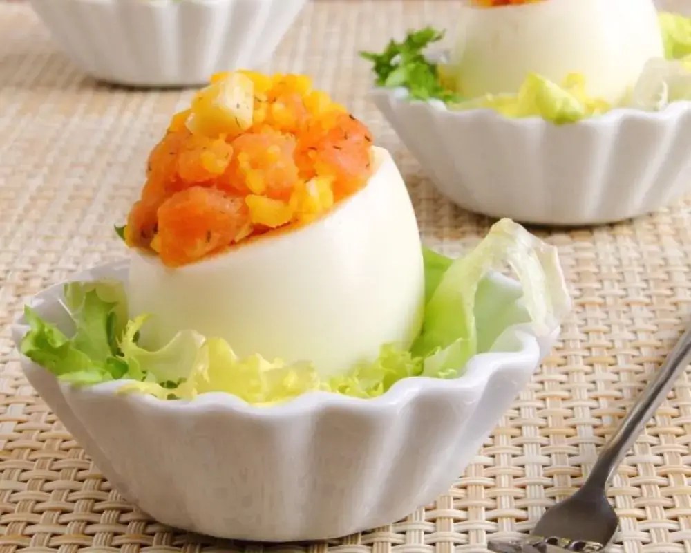 Un poco más elaborado que los anteriores, pero igual de sencillo. Pon a coger tantos huevos como quieras preparar y una vez estén listos y pelados, corta la parte de arriba y retira la yema. Mezcla esta con trocitos de salmón y rellena los huevos. Puedes hacer distintas variaciones, por ejemplo, añadirles especias, cebolla, mahonesa y hasta aguacate.