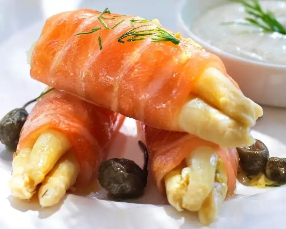 Una de las mejores combinaciones es la de dos ingredientes frescos y ligeros para que resulte un aperitivo fácil de comer y nada copioso. Estos rollitos son realmente sencillos y rápidos de preparar, porque lo único que tienes que hacer es coger varios espárragos blancos, cortarlos a la mitad, y enrrollarlos con una loncha de salmón. Pon un poco de mahonesa para acompañar y listo.