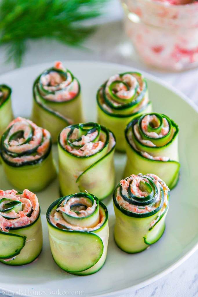 Este es uno de los aperitivos más sanos que puedes encontrarte, ya que todo está crudo y solo son ingredientes naturales. Para preparerlo, tienes que empezar por cortar en tiras finas el calabacín con la ayuda de un pelador para después, rellenarlos en forma de rollitos con la mezcla de salmón troceado y la mahonesa.