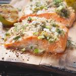 Colocar sobre la parrilla una tabla de madera húmeda y, sobre ella, los lomos de salmón