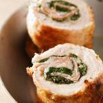 Salpimentar la carne de cerdo y disponer sobre ella las lonchas de panceta, las espinacas y el queso