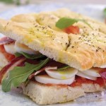 Cortar la focaccia en 4 cuadrados rectangulares y abrir cada uno por la mitad