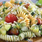 En una ensaladera, mezclar la pasta con los tomates, los quesitos, los calabacines y los piñones