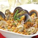 Lavar las almejas con agua fría y abrirlas en el mismo caldo de la cocción de los mejillones