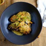 Servir el pollo tostado cubierto de salsa de mostaza y cúrcuma