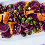 Emplatar con las patatas azules en el fondo, los níscalos calientes por encima y la vinagreta