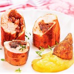 Corta los rulos de pollo en 3 trozos sacando las puntas y colócalos en el plato en forma vertical
