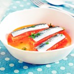 Presenta poniendo las sardinas y el tomate sobre un lecho de crema de tomate