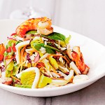 Corta las patas del pulpo en rodajas, pela las gambas y saltéalas