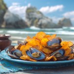 Una vez que la mayonesa esté lista, es momento de montar el plato. Coloca las patatas fritas en una bandeja grande, asegurándote de que estén bien distribuidas. Luego, vierte la mayonesa de mejillones sobre las patatas, asegurándote de cubrirlas uniformemente. Para un toque final, coloca los mejillones enteros por encima y añade unas aceitunas para darle un contraste de sabor.