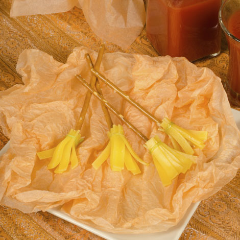 Un aperitivo que gustará a todos, especialmente a los más pequeños de la casa. Solo necesitas unas lonchas de queso, un poco de cebollino y unos palitos de pan. Parte cada loncha de queso por la mitad, córtala en tiras sin llegar al final y envuelve con ella el palito de pan. Sujeta el queso con una tira de cebollino. Así de fáciles son estas escobas de bruja.