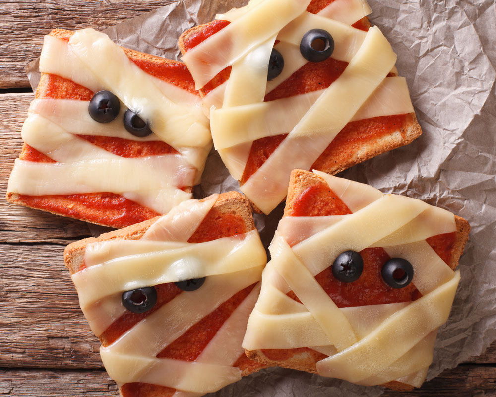 Con una rebanada de pan de molde tostado, un poco de tomate frito sobre ella y unas tiras de queso consigues una momia tan original como la de la foto. Usa dos aceitunas negras para los ojos. ¡Y tienes un aperitivo de Halloween original y divertido!