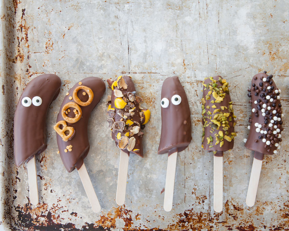 Unos plátanos partidos por la mitad e insertados en palitos de polos, cubiertos con chocolate fundido, unos toppings originales y ya está el lío montado.