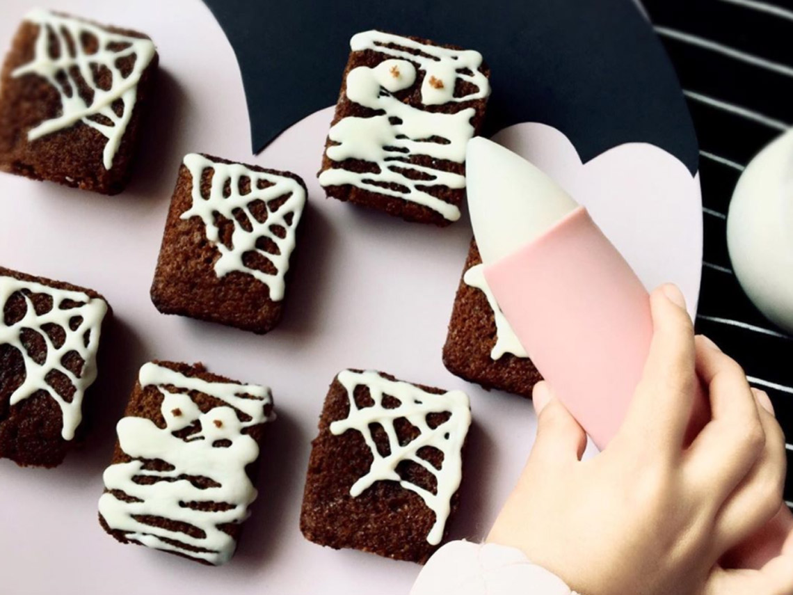Prepara un brownie y córtalo en pequeñas porciones rectangulares. Con ayuda de una manga pastelera decora con cobertura de chocolate blanco. Puedes dibujar telas de araña, caras, ojos, arañas…