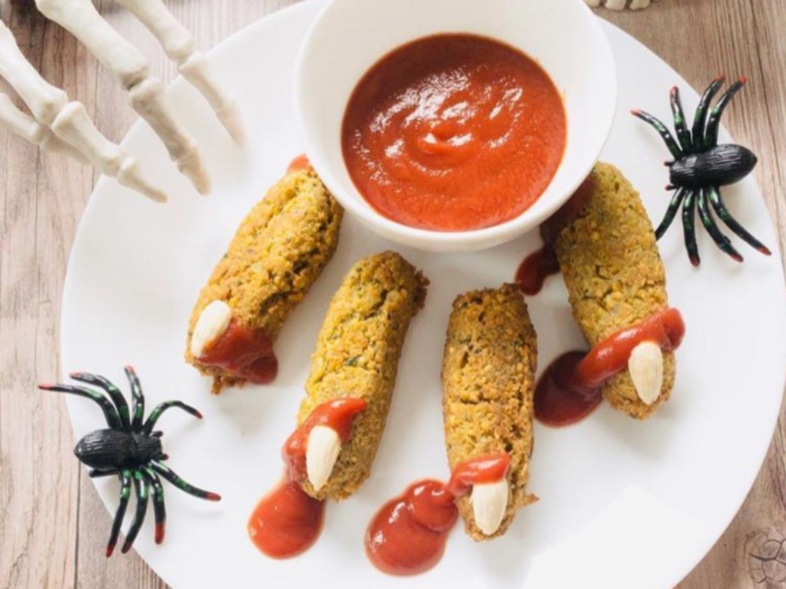 Prepara unos falafeles, pero en vez de darles forma redondeada, hazlos como si fueran dedos, es decir, cilindros un poco gruesos. Ponle uñas a estos deliciosos dedos con láminas de almendra y decora con kétchup como si fuera sangre.
