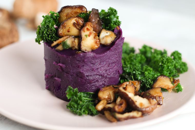 Hierve a fuego lento la remolacha junto a unas cuantas patatas y un puñado de sal. Cuando estén listas, saca, pasa por el pasapuré y reserva. Pasa las setas laminadas por la sartén junto a un ajo picado. Presenta el puré como aparece en la foto y usa las setas de topping. Pica fino el kale y sírvelo junto a las setas y un chorreón de aceite de oliva virgen extra.