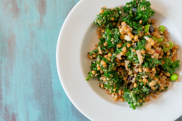 No encontrarás una ensalada más saludable que esta. Prepárala con quinoa y kale y si te apetece un toque crujiente, añade croutons, pollo crujiente, trocitos de bacon o almendras. En cuanto al aliño, un poquito de aceite bastará para darle un sabor delicioso.
