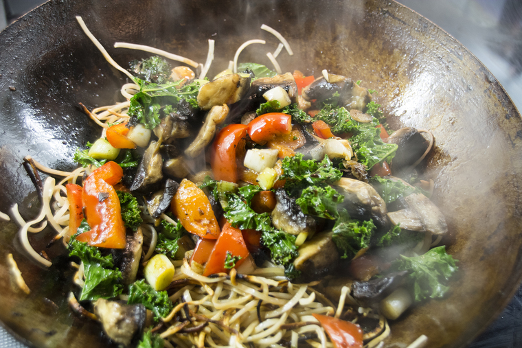 Cocinado al wok es otra de sus múltiples opciones. Quedará crujiente y delicioso. Aquí junto a vegetales y fideos chinos . Cuece los fideos antes en agua abundante y añádelos al wok cuando las verduras estén listas. Añade salsa de soja un instante antes de apagar el fuego y sirve muy caliente.