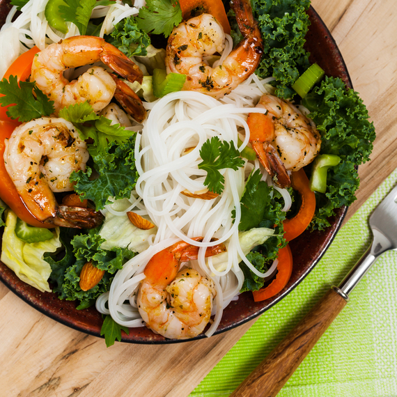 También va muy bien con pescado o mariscos. Aquí, en una receta de inspiración china junto a fideos de arroz que previamente habrás hevido, hojas de kale crudo y gambas a la parrilla. Puedes añadirle salsa agridulce o de ostras para un sabor más intenso.
