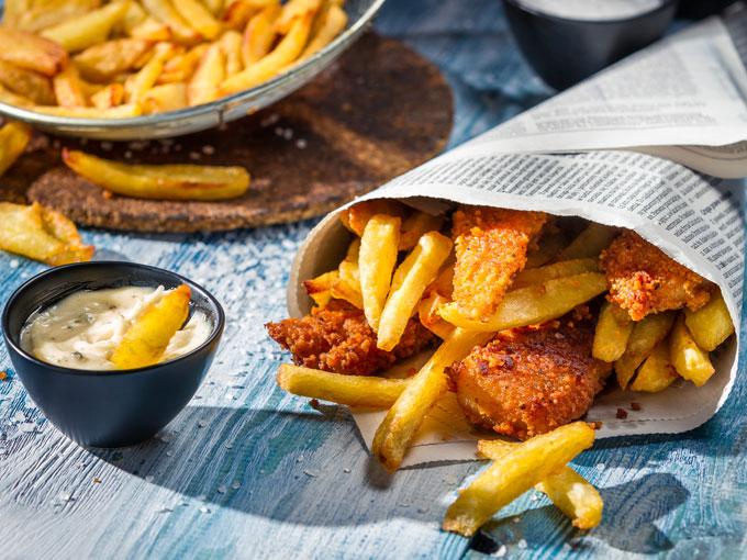 Porciones de pescado con un rebozado supercrujiente acompañado de unas deliciosas patatas fritas. ¿Alguien puede resistirse? Imposible.