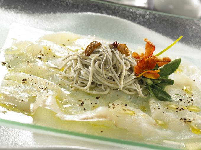 El carpaccio es una receta típica de la cocina italiana donde se sirven las piezas, generalmente de carne, sin cocinar, cortadas en filetes extremadamente finos (casi transparentes) y que se aliñan con aceite de oliva y un poco de limón. En este caso apostamos por un carpaccio de bacalao con gulas que te sorprenderá. ¿La clave? Tener un cuchillo muy afilado para cortar muy finamente el pescado.