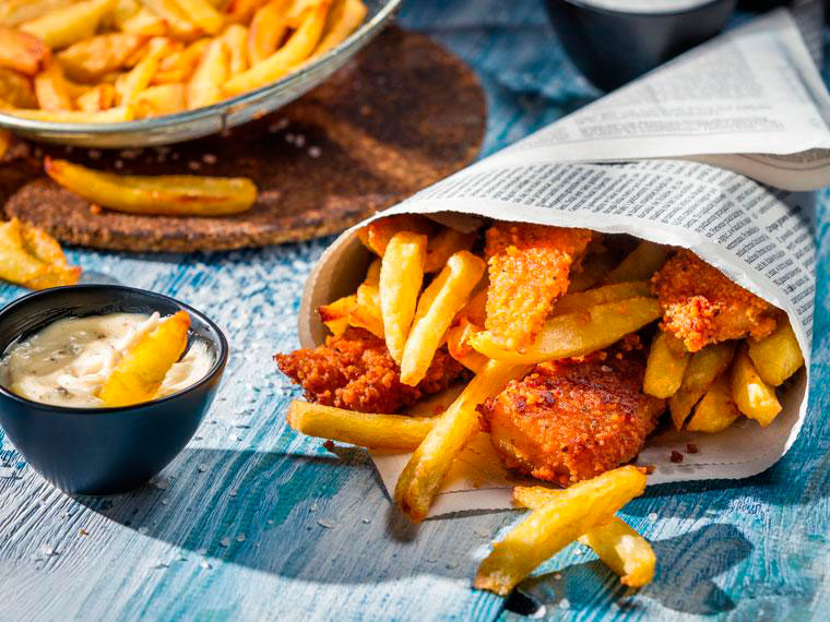 El fish and chips es una receta clásica británica de la comida “para llevar”. Es un plato de patatas fritas con pescado rebozado, todo ello envuelto en papel de estraza. Aunque está considerado como comida rápida, preparado casero no tiene porqué resultar insano. Lo que tenemos que considerar a la hora de prepararlo es que no quede aceitoso. Por eso hay que escurrirlo todo muy bien con papel absorbente antes de servirlo. Podemos utilizar el pescado que más nos guste: merluza, bacalao, fletán… Eso sí, con pescado fresco quedará mucho más sano que con los palitos de pescado que venden congelados.