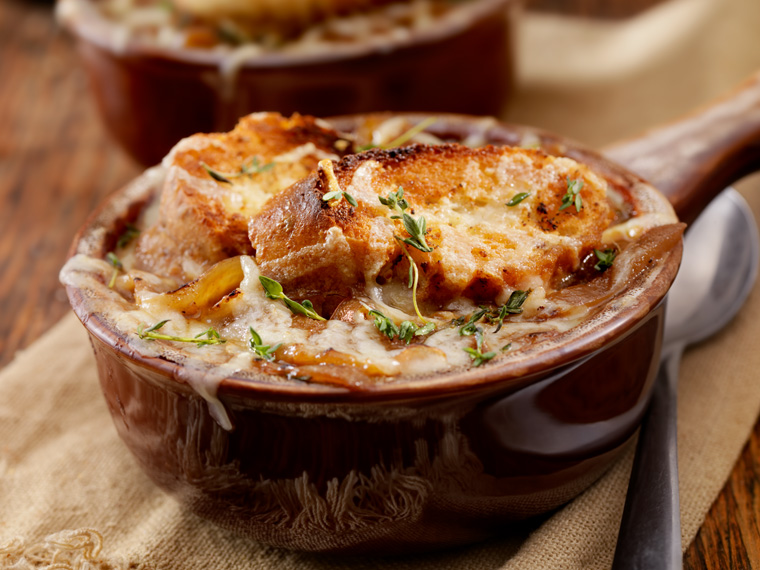 Plato emblemático de la cocina tradicional francesa. Se inventó durante la Revolución Francesa cuando se disponía únicamente de ingredientes sencillos para cocinar. Se cocina por no más de dos horas con trocitos de pan, caldo de carne cebolla caramelizada y queso fundido.