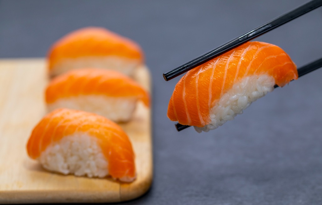 Esta es la pieza más tradicional de la gastronomía japonesa. Se trata de pequeñas porciones de arroz compactadas de forma ovalada, sobre la que se colocan finas tiras de pescado, como el atún o el salmón. Suele comerse mojados en salsa de soja.