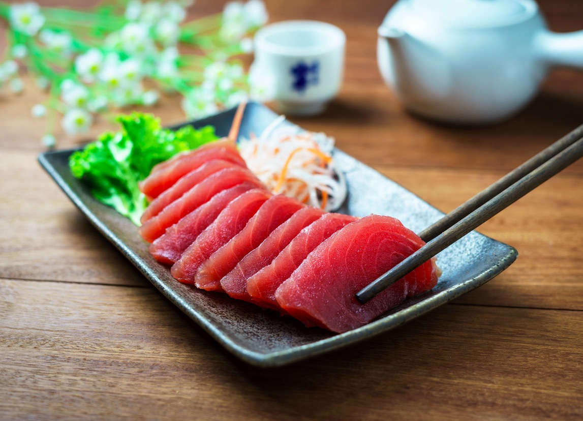 El sashimi se forma con láminas de pescado crudo -entre las que destacan el salmón, el atún y el pez mantequilla-.No lleva arroz, y se suele servir con una salsa y un aderezo simple como rábano daikon rallado.